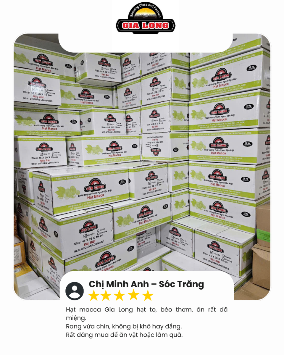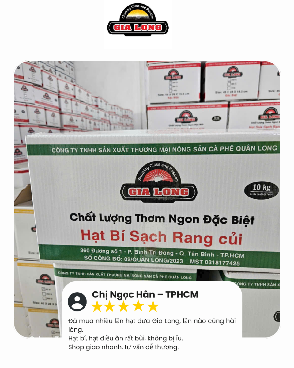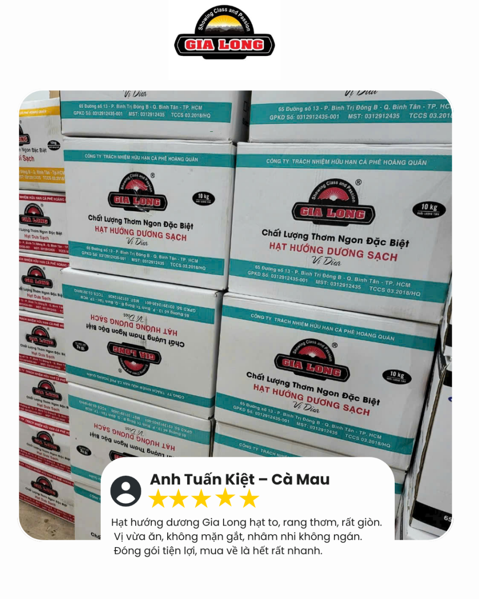 Nhiều khách hàng chia sẻ rằng họ lựa chọn GIA LONG bởi sự chỉn chu trong từng sản phẩm. Từ hạt dưa, hạt bí đến các loại hạt dinh dưỡng và đồ ăn vặt, các sản phẩm đều được đóng gói gọn gàng, dễ sử dụng và phù hợp với nhiều mục đích khác nhau.Một số khách hàng lâu năm đánh giá cao sự ổn định về chất lượng, cho rằng đây là yếu tố giúp họ yên tâm quay lại và tiếp tục đồng hành cùng GIA LONG trong thời gian dài. Những phản hồi này chính là minh chứng rõ ràng cho định hướng phát triển bền vững mà GIA LONG đang theo đuổi.